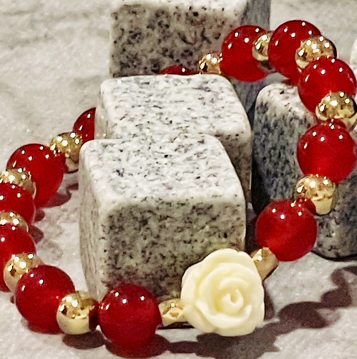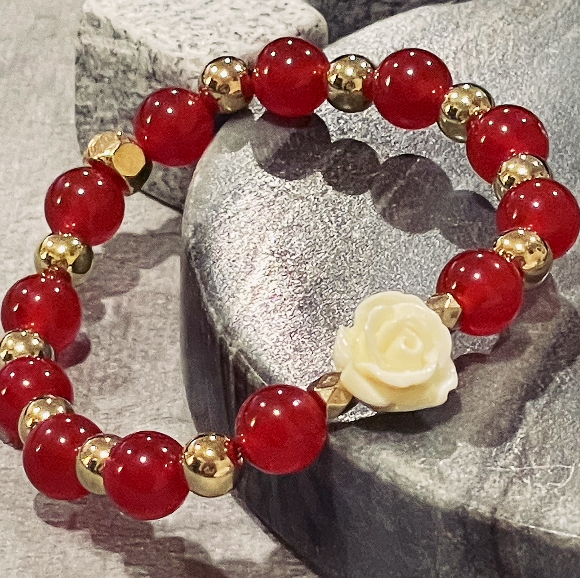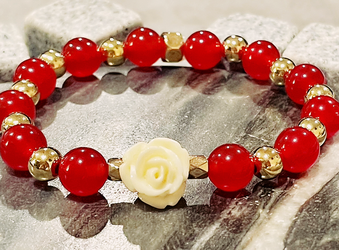 Perfect for Valentine’s Day, this elegant design featuring a 8mm Red Quartz and a captivating Cream Flower centerpiece will elevates any outfit. The stunning gold accents add a touch of luxury and sophistication, making it a must-have for any fashion-forward individual. Not only does it make a statement, but it also adds a touch of class and versatility to your jewelry collection.